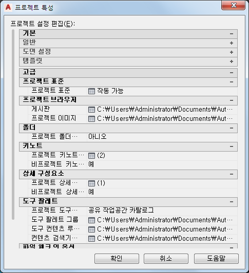 표준, 이미지, 키노트, 상세 구성요소 및 도구 팔레트와 같은 고급 프로젝트 특성을 정의하거나 수정할 수 있습니다.