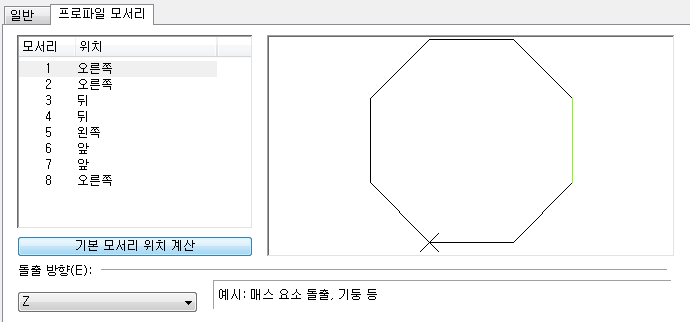 사용 가능한 모서리 위치는 선택한 돌출 방향에 따라 다릅니다.