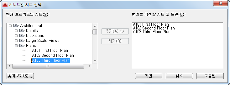 | 다른 시트의 모든 키노트 포함 | 오른쪽 클릭한 후 시트를 클릭하여 키노트 범례에 대한 시트 선택 대화상자를 표시합니다. 왼쪽 창에는 현재 프로젝트의 시트가 나열됩니다. 원하는 시트를 선택하고 추가를 클릭하여 오른쪽 창으로 이동시킵니다. 또한 찾아보기를 클릭하여 시트로 저장되지 않은 다른 프로젝트나 도면의 시트를 찾고 검색할 수 있습니다. 오른쪽 창에 키노트를 포함할 모든 도면/시트가 표시되면, 확인을 클릭합니다. |