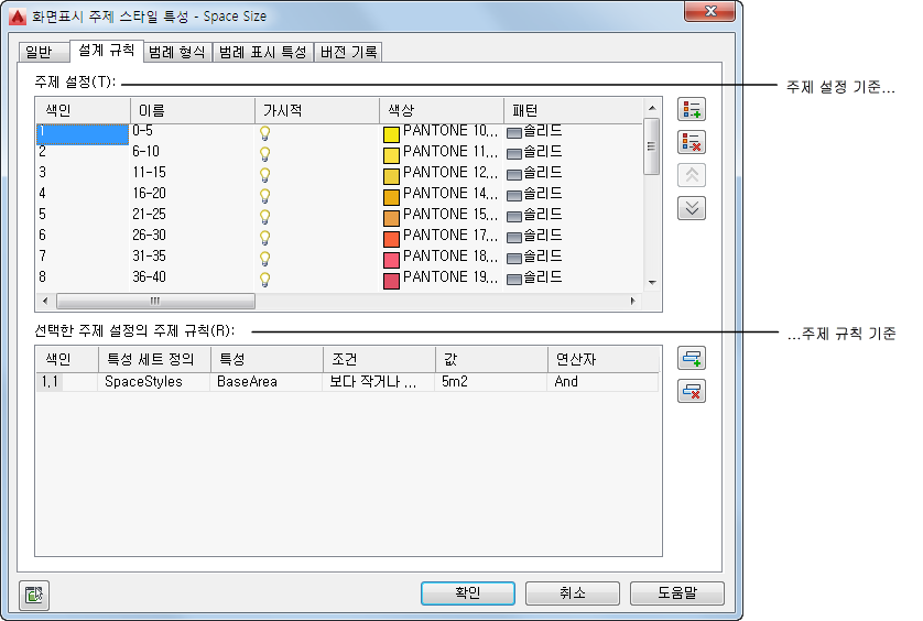 화면표시 주제 스타일은 지정한 기준과 일치하는 객체를 강조 표시하여 도면에서 비 그래픽 데이터 통합에 사용하는 특정 화면표시 주제를 정의합니다. 강조 표시의 종류는 하나 이상의 주제 설정을 통해 조정되며, 각 설정은 특성 색상 채우기, 해치 또는 선종류를 지정합니다. 각 주제 설정에는 해당 설정을 사용하여 강조 표시할 객체를 결정하는 하나 이상의 주제 규칙이 있습니다.