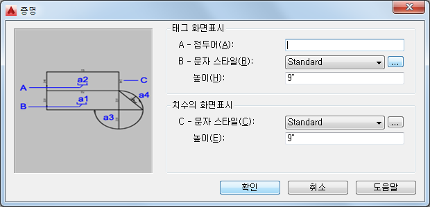 다음 절차에 따라 공간 분해의 하위 도면요소에 대해 표시되는 태그 및 모서리 치수에 대한 문자 특성을 지정하십시오.