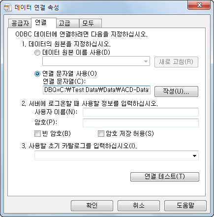 주: 여기서는 이 드라이버 외에도 Microsoft Access Driver(*.mdb)와 Microsoft Text Driver(*.txt, *.csv)가 지원됩니다. 이러한 드라이버를 사용하여 Access 데이터베이스, 일반 ASCII 문자 파일 또는 쉼표로 구분된 파일에 대한 링크를 작성할 수 있습니다.