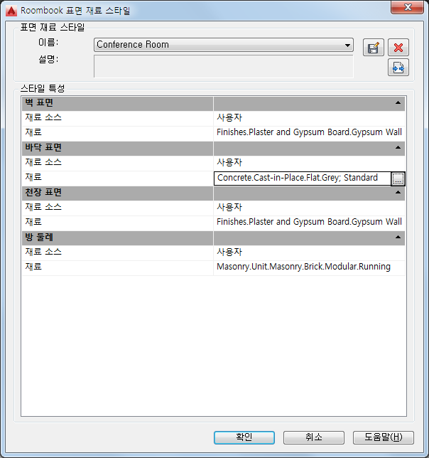 - 표면 재료 스타일은 카탈로그 파일 Roombook Styles.dwg에 저장됩니다.