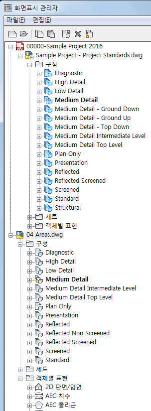 프로젝트 표준 구성에서 화면표시 표준 도면으로 정의된 도면은 프로젝트 노드 아래에 나열됩니다.