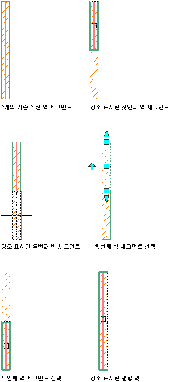 다음 그림에서는 각각의 별도 세그먼트를 강조 표시한 후 두 개의 직선 벽 세그먼트를 결합하는 방법을 보여줍니다.