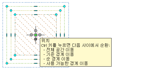 다음 과정에 따라 그립을 사용하여 개별 공간 경계를 다른 위치로 이동하십시오. 간격띄우기 경계에 대해 수동을 선택한 경우에만 개별 경계를 이동할 수 있습니다.