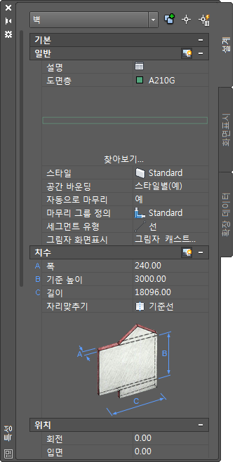 특성 팔레트는 객체의 물리적 특성과 그래픽 특성을 보고 수정할 수 있는 중앙 위치를 제공합니다. 여기서 객체는 그리려는 객체이거나 도면 영역에서 선택한 기존 객체일 수 있습니다. 또한 특성 팔레트의 확장 데이터 탭을 사용하여 분류, 주, 참조 문서, 하이퍼링크 및 특성 세트 데이터와 같은 기타 정보를 객체에 부착할 수 있습니다. 일반적으로 사용자는 AutoCAD Architecture 세션 중에 특성 팔레트를 계속해서 열어 놓습니다.