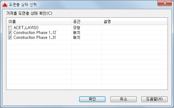 - 저장된 도면층 상태가 여러 개 있는 DWG, DWS 또는 DWT 파일을 선택한 경우 도면층 상태 선택 대화상자에서 원하는 상태를 선택한 다음 확인을 클릭합니다.