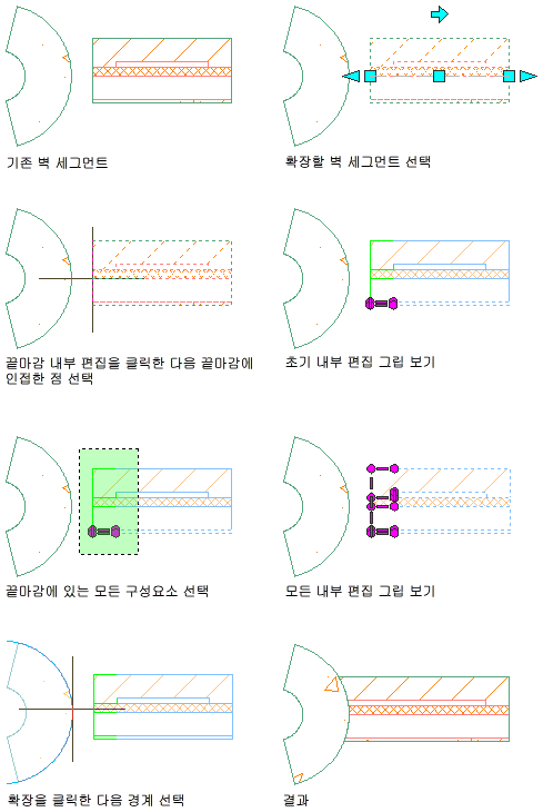 다음 과정에 따라 구성요소를 연장할 벽 끝마감을 수정하십시오. 연장 경계는 선, 호, 원, 폴리선 또는 벽 구성요소 모서리일 수 있습니다.