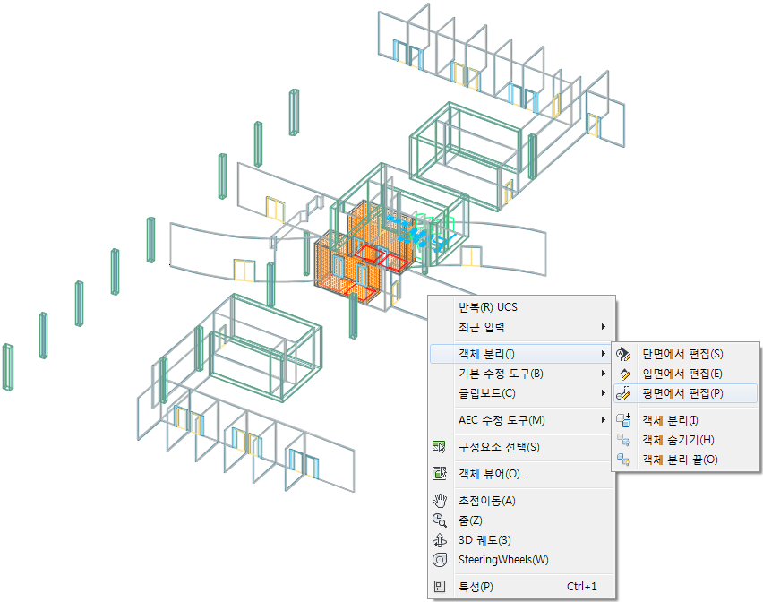 도면에서 객체를 선택하고 임시 단면, 입면 또는 평면도에서 객체를 보고 편집할 수 있습니다. 객체를 편집하는 동안 UCS가 임시 뷰에 정렬됩니다.