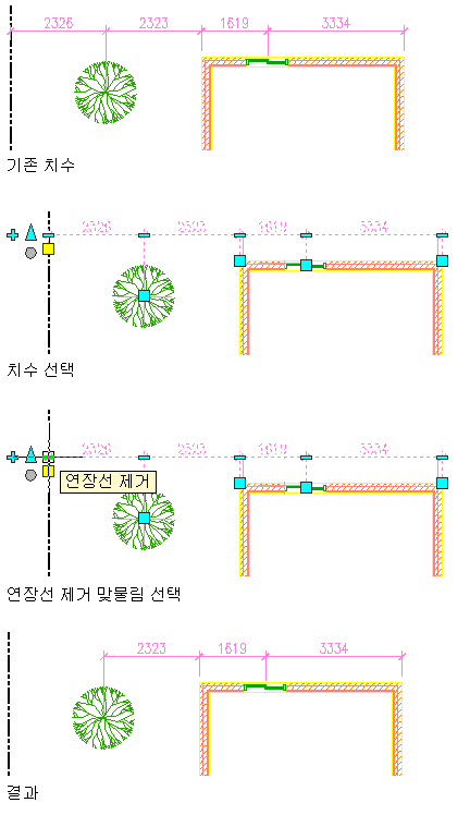 스타일이 정의되지 않은 치수점은 객체 OSNAP 점을 선택하거나 도면에서 객체와 연관되지 않은 점을 선택하여 생성된 점일 수 있습니다. 스타일이 정의된 치수점과는 달리 이 점은 한 번 삭제하면 복원할 수 없지만 필요하면 다시 작성할 수 있습니다.
