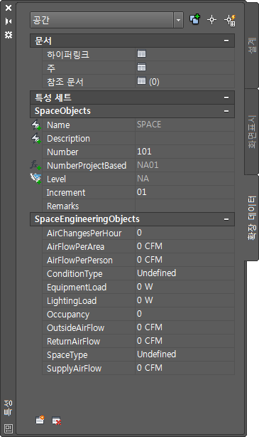 | LightingLoad | 방의 조명 부하를 입력합니다. 스타일에서 면적당 조명 부하를 지정한 경우 DefaultLightingLoad 특성 세트에서 방 면적을 기준으로 조명 부하를 계산합니다. LightingLoad 값을 입력하여 이 값을 재지정할 수 있습니다. |