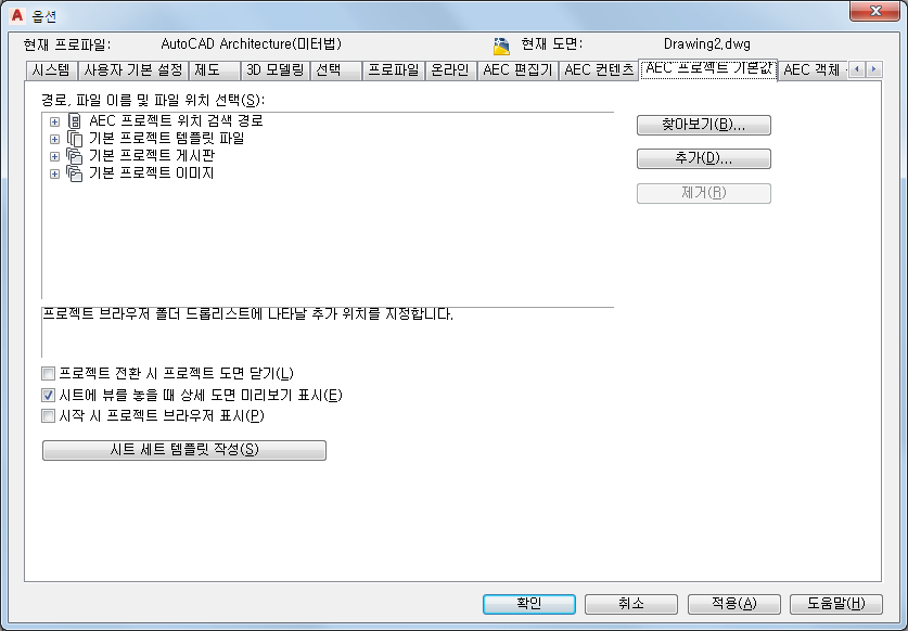 현재 도면에 대해 AEC 프로젝트 기본값 옵션 지정