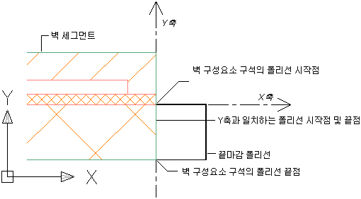 유효한 벽 끝마감 폴리선은 Y 축의 벽 구성요소 구석에서 시작됩니다. 이상적으로 폴리선도 Y 축의 다른 벽 구성요소 구석에서 끝나므로 폴리선 시작점과 끝점이 모두 Y 축과 일치하고 둘 다 동일한 X 값을 가집니다.