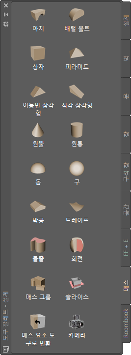 작업영역의 기본 도구 팔레트에는 필요에 따라 사용하거나 사용자화할 수 있는 매스 도구가 들어 있습니다. 또한 소프트웨어에서 제공하는 다음과 같은 카탈로그에는 도구 팔레트에 추가할 수 있는 매스 도구가 들어 있습니다.
