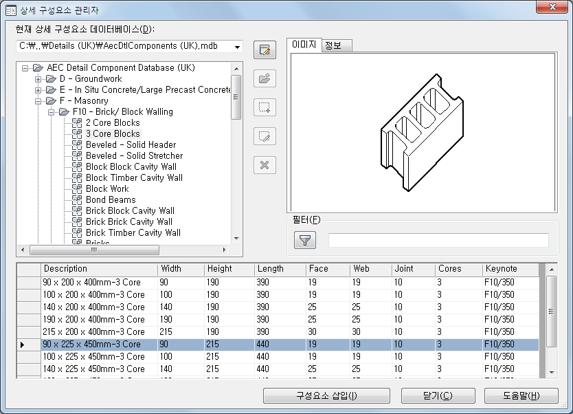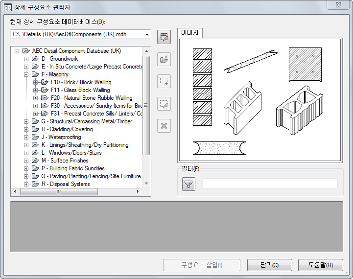 콘크리트 석조 테이블이 표시된 상세 구성요소 관리자 대화상자