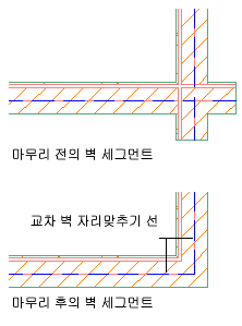- 교차하는 벽 세그먼트는 명확한 구석 조건에서 교차하는 벽 자리맞추기 선과 만나도록 잘립니다.
