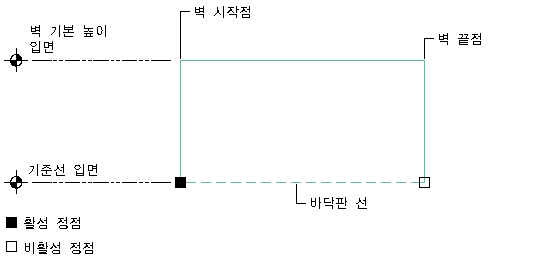 벽의 지붕 및 바닥판 선을 수정하여 직사각형이 아닌 벽을 작성할 수 있습니다.