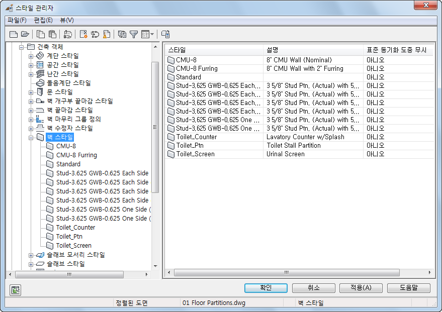 스타일은 문 스타일과 같은 건축 객체, 일람표 테이블 스타일과 같은 문서 객체, 도면층 키 스타일과 같은 다목적 객체의 세 가지 범주로 구성됩니다. 각 범주 내에서 스타일은 알파벳 순으로 나열되어 있습니다. 하나의 스타일 유형에 대한 스타일만 표시하도록 트리 뷰를 필터링하려면 스타일 유형을 선택한 후 스타일 관리자 도구막대에서