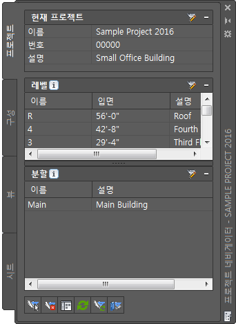 프로젝트 네비게이터 팔레트는 AutoCAD Architecture 프로젝트 파일을 작성, 수정 및 액세스하는 중앙 위치입니다. 일반적으로 작업공간에 프로젝트 네비게이터 팔레트를 열어 둔 상태로 프로젝트에서 작업합니다.
