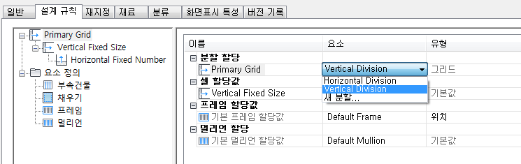 분할은 그리드 방향(그리드 셀 및 멀리언의 방향이 수직인지 또는 수평인지 여부) 및 분할 유형(셀의 개수 및 크기)를 정의합니다.