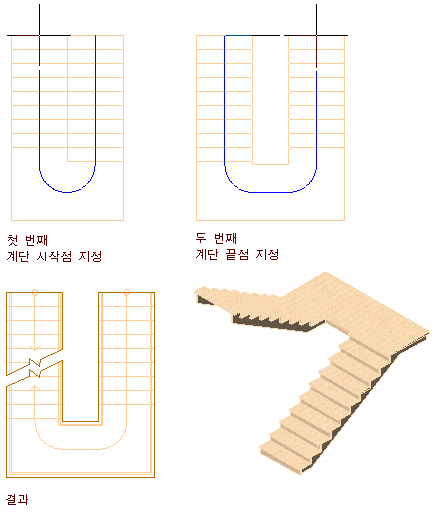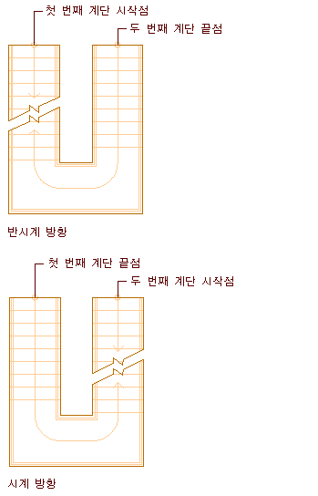 | 오른쪽이 계단의 바깥 모서리가 되고 왼쪽이 계단의 안쪽 모서리가 되는 U자형 계단 그리기 | 수평 방향에서 시계 반대 방향을 선택합니다. |