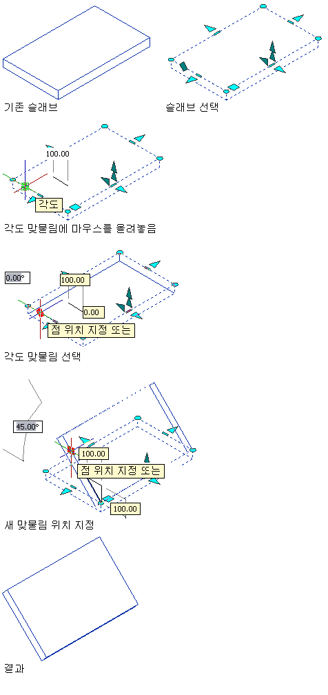 | 슬래브의 단높이를 변경하여 물매 조정 | 단높이 값이 강조 표시될 때까지 Tab 키를 누른 후 값을 입력하거나 원하는 단높이가 표시될 때까지 그립을 이동한 후 클릭합니다. |