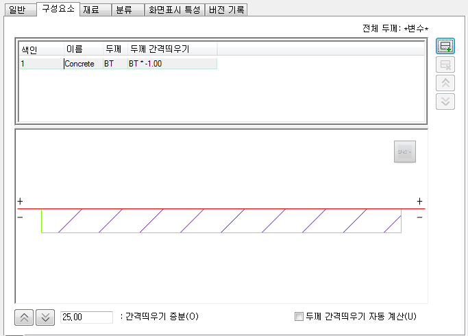 슬래브/지붕 슬래브 구성요소의 두께 및 간격띄우기 지정 정보