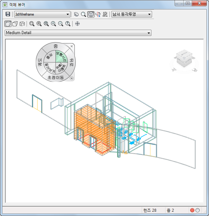SteeringWheels는 쐐기라는 여러 섹션으로 나뉘어 있는 추적 메뉴입니다. 휠의 각 쐐기는 하나의 탐색 도구를 나타냅니다. 여러 방법으로 모형의 현재 뷰를 초점이동, 줌 또는 조작할 수 있습니다.