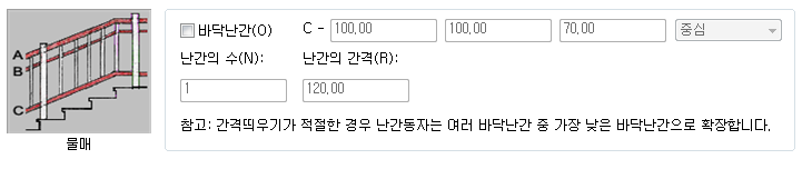 | 둘 이상의 바닥 난간 지정 | 난간 수에 값을 입력합니다. 다중 바닥 난간을 지정할 때 난간의 간격두기에 값을 입력할 수 있습니다. |