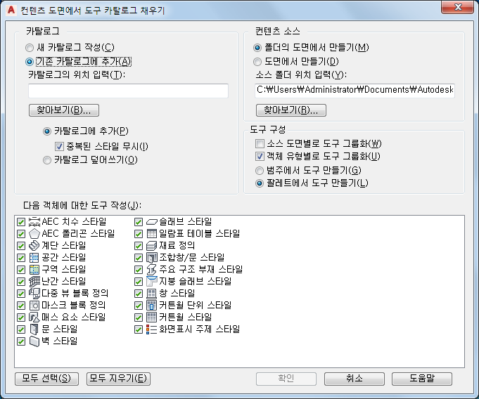 이 옵션은 다양한 도면의 스타일을 팔레트나 카탈로그에 병합하려는 경우에 적합합니다. 결과로 생성된 도구는 "벽", "문" 등과 같이 스타일 유형의 이름을 딴 범주 또는 팔레트에 배치됩니다.
