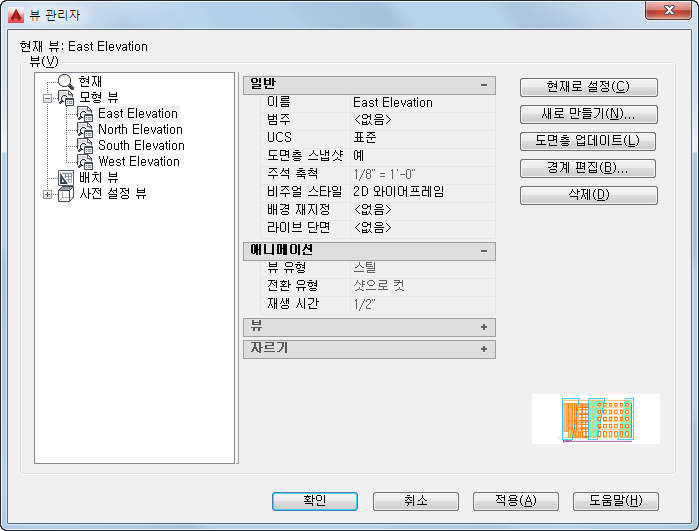 열려는 모형 공간 뷰를 선택하고 현재 설정을 클릭합니다.