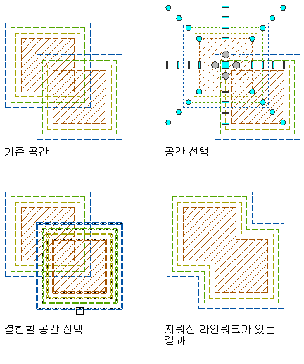 첫 번째 선택된 공간의 경계에 대한 화면표시 특성이 병합된 결과 경계에 적용됩니다. 예를 들어, 첫 번째 공간의 순 경계가 선가중치는 0.18mm이고 빨간색일 경우 병합된 결과 공간의 순 경계는 선가중치가 0.18mm이고 빨간색이 됩니다.