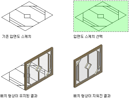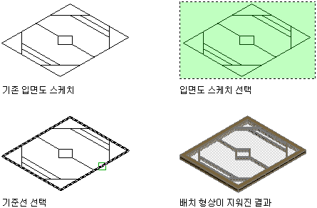 팁: XY 평면에서(평면도에서) 라인워크를 그리고 기본 기준선을 적용하는 경우 작성되는 조합창/문은 Z 방향에서 표시됩니다.