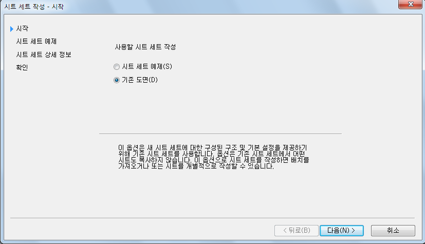옵션을 클릭합니다. 시트 세트 작성 마법사가 표시됩니다. 마법사를 사용하여 새 시트 세트 템플릿을 작성할 수 있습니다.