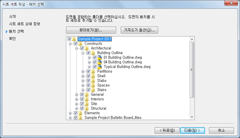 다음 절차에 따라 하나 이상의 기존 도면의 배치를 포함하는 시트 세트 템플릿을 작성하십시오. 시트 제목에 파일 이름을 접두어로 지정하고 폴더 구조를 기반으로 하위 세트를 작성하는 옵션을 선택할 수도 있습니다. 시트 세트가 위치한 프로젝트에서 프로젝트 특성 대화상자에 있는 최상위 범주를 리디렉션하는 경우 여기서 적용된 설정이 재지정됩니다.