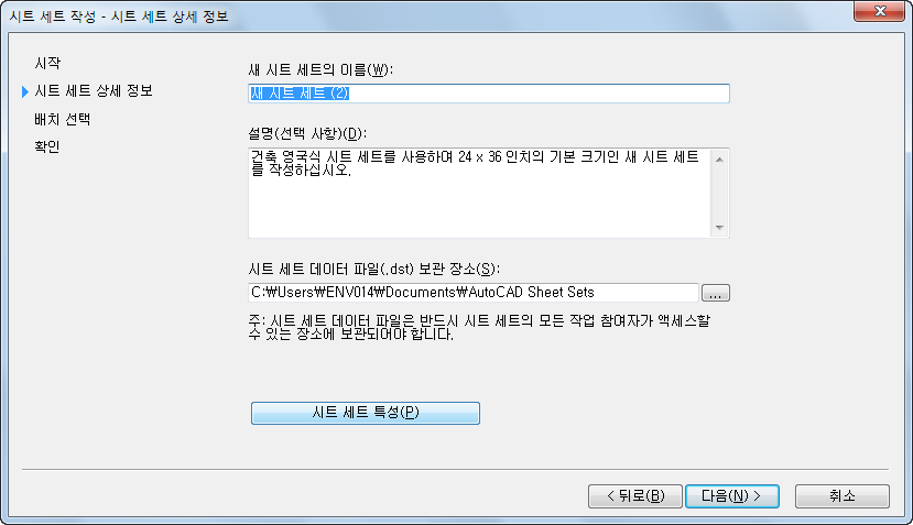 시트 세트 마법사가 표시됩니다. 마법사를 사용하여 새 시트 세트 템플릿을 작성할 수 있습니다.
