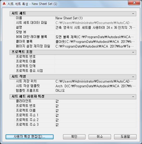 AutoCAD Architecture 프로젝트에 시트 세트 템플릿을 사용하는 경우 다음 필드를 완료할 필요가 없습니다.