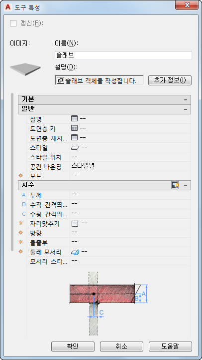 슬래브 모서리 스타일이 기본값으로 설정되어 있는 슬래브 도구 특성