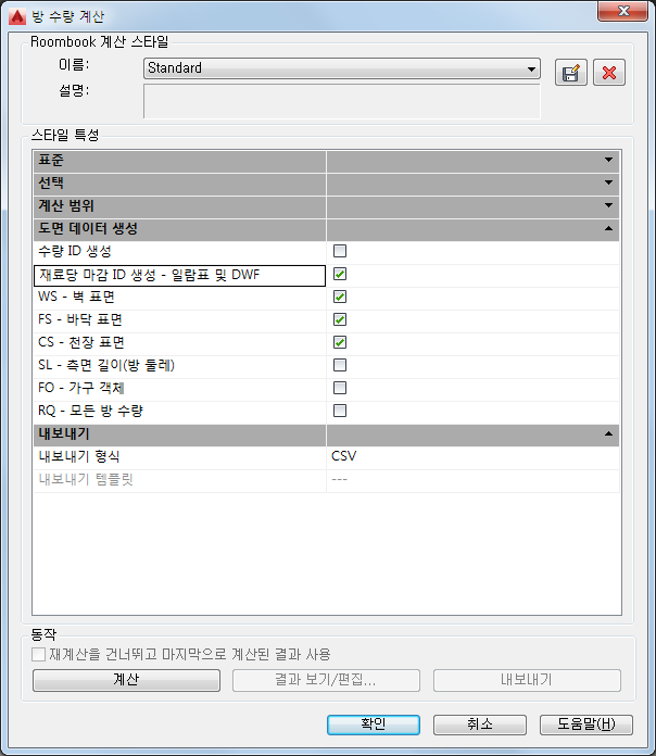 - 방 수량 계산 대화상자의 스타일 특성 아래, 도면 데이터 생성 리스트에서 재료당 마감 ID 생성을 선택합니다.