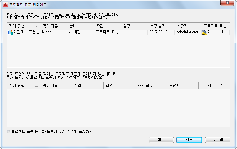 이 경우 프로젝트 표준 도면의 버전은 프로젝트 도면의 버전으로 덮어쓰지 않습니다. 다음에 프로젝트 도면을 동기화하는 동안 화면표시 설정은 프로젝트 표준과 동기화되지 않은 것으로 표시됩니다.