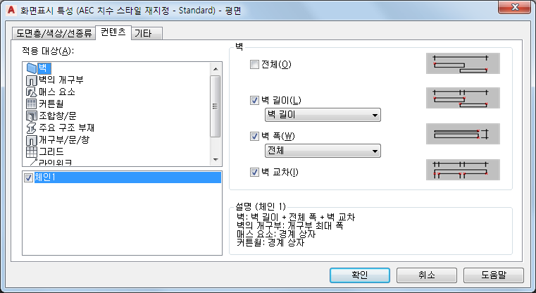 적용 대상 리스트의 AEC 치수 스타일에서 사용 가능한 체인 리스트를 찾습니다.