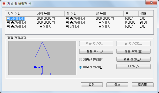 맨 위에 있는 표에는 커튼월의 각 정점에 대한 정보가 표시됩니다. 리스트에서 편집할 정점을 선택할 수 있습니다.