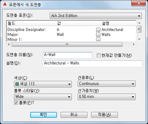 다음 과정에 따라 도면에 대해 선택된 도면층 표준을 준수하는 도면층을 작성하십시오. 도면층 표준은 표준에 정의된 구조에 따라 새 도면층의 이름을 정의합니다. AutoCAD Architecture는 현재 도면층 표준에 따라 필요한 도면층을 작성합니다. 예를 들어, 도면에 벽을 추가할 경우 소프트웨어는 필요한 벽 도면층이 없으면 필요한 벽 도면층을 작성합니다.