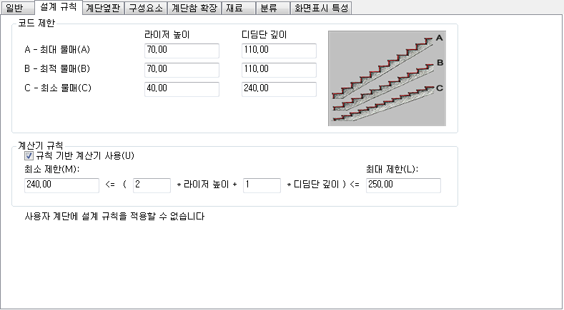 다음 절차에 따라 라이저 높이 및 디딤단 폭에 대한 최소, 최대 및 최적 코드 제한을 지정하고 계단 계산기 규칙을 지정하십시오.