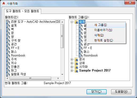 팁: 사용자화 대화상자는 프로젝트 팔레트 그룹에 팔레트를 추가할 때 매우 유용합니다.