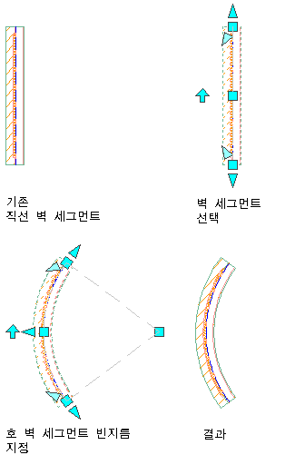 다음 과정에 따라 직선 벽을 곡선 벽으로 변경하거나 곡선 벽을 직선 벽으로 변경하십시오. 직선 벽을 곡선 벽으로 변경할 때, 소프트웨어는 벽 세그먼트의 중간점에 곡선 두 번째 점 그립을 추가합니다. 그러면 이 그립을 사용하여 호의 쉐이프를 변경할 수 있습니다.