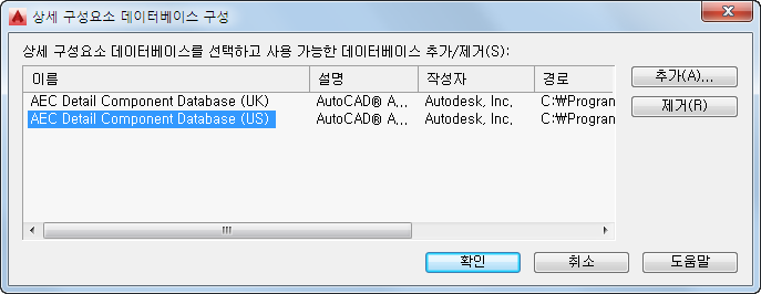 - AEC 컨텐츠 페이지에서 상세 구성요소 데이터베이스의 추가/제거 버튼을 클릭합니다.