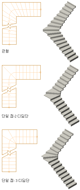단일점 돌음단 스타일을 사용하면 돌음단 회전 중심에 디딤단 모서리 또는 라이저 면을 맞출 수 있고, 돌음단 회전에서 개별 디딤단을 추가하거나 제거할 수 있습니다. 또한 기본 디딤단 수를 돌음단 회전에 지정하면 지정된 수의 디딤단을 계단 회전 구역에 나타낼 수 있습니다.