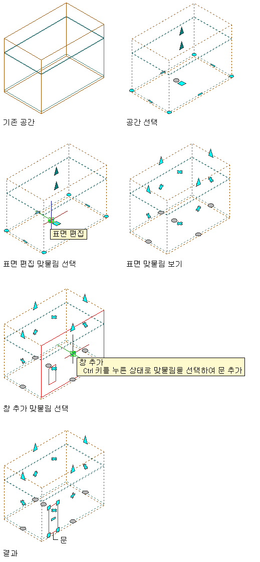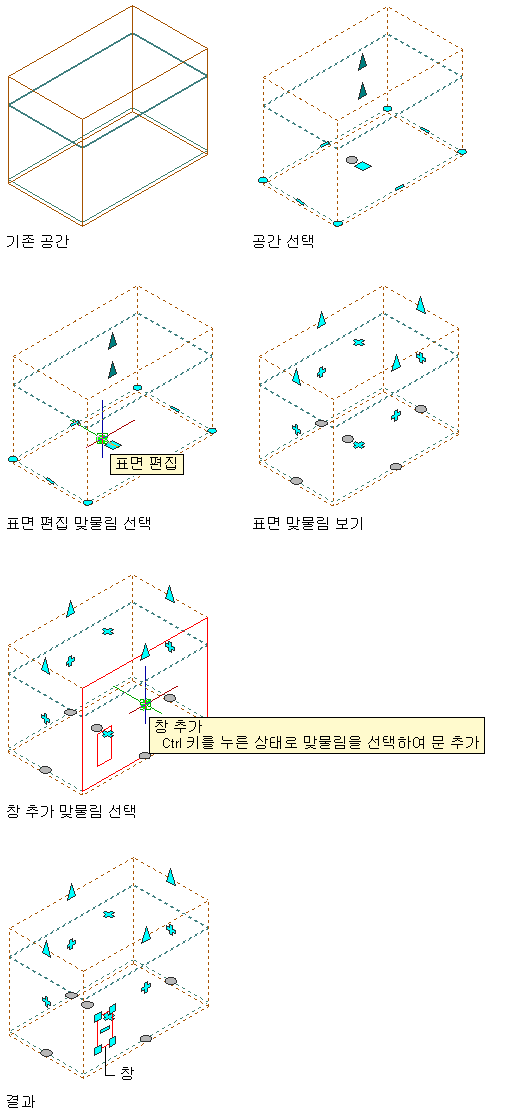 주: 표면 편집 모드를 종료한 후에 개구부가 표시되지 않으면 공간 스타일이나 공간 객체 화면표시 특성에서 표면 구성요소 화면표시 구성요소가 활성화되지 않은 것입니다.